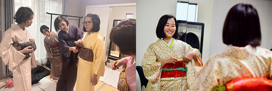 きもの装美着付学院では、ベテランの講師陣が、初心者の方にも優しくマンツーマンでサポート致します。