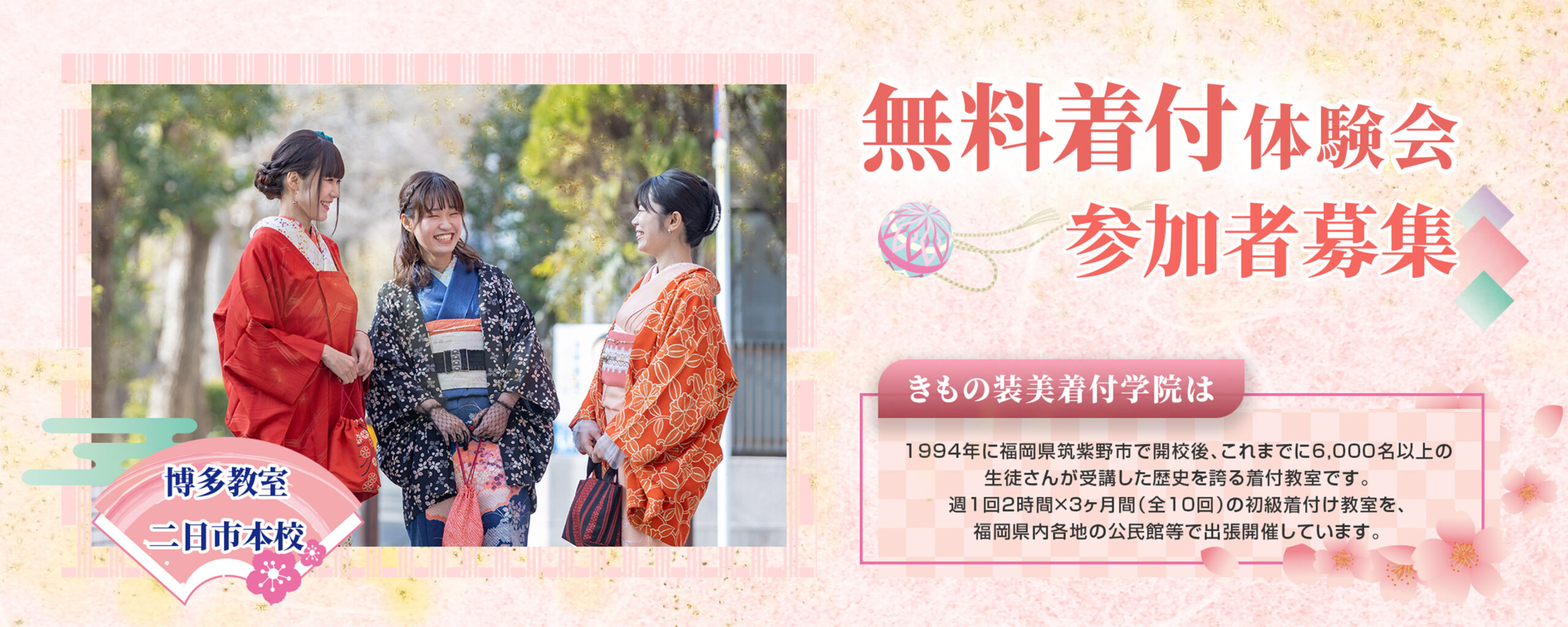 無料体験会では実際にきものを着ながら、担当講師が着付け教室の流れや注意事項等をご説明します。「博多教室」、「二日市本校」では、無料できものや帯を貸し出していますので、手ぶらでお越しください。なお、常設会場以外では説明会の開催となります。